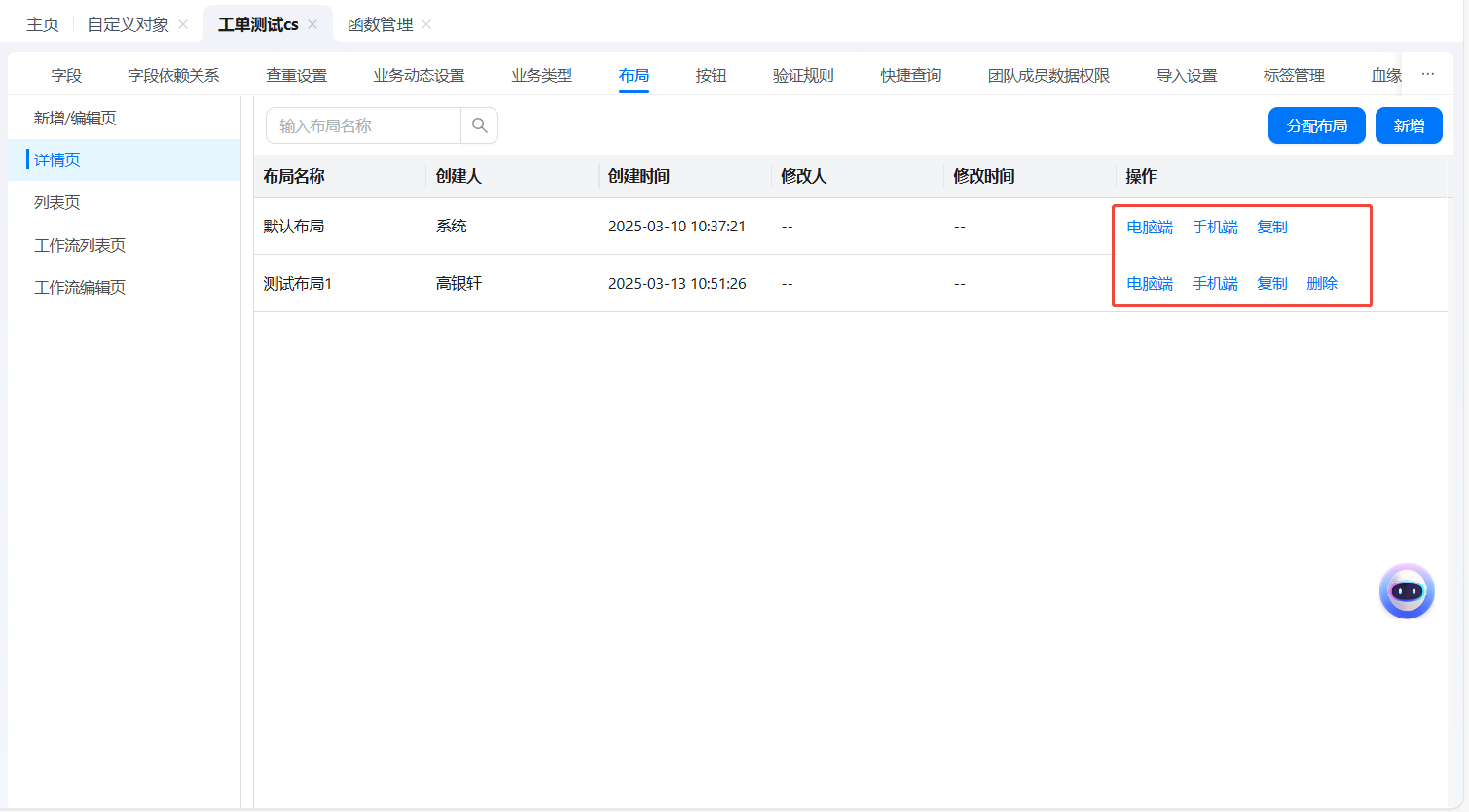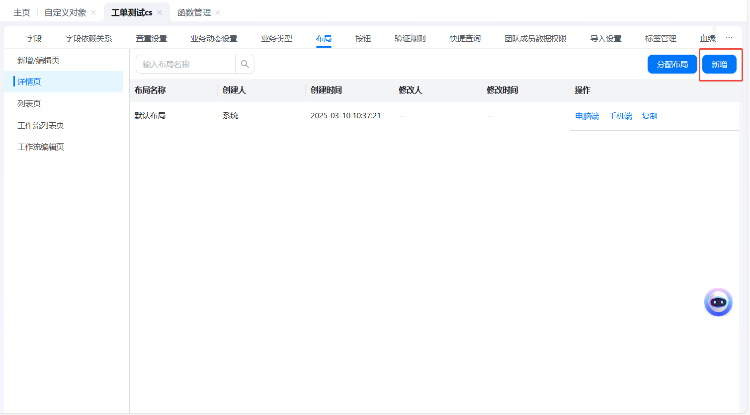 - 对象详情页面-->布局-->详情页-->点击【新增】按钮,即可进行新增布局设置。