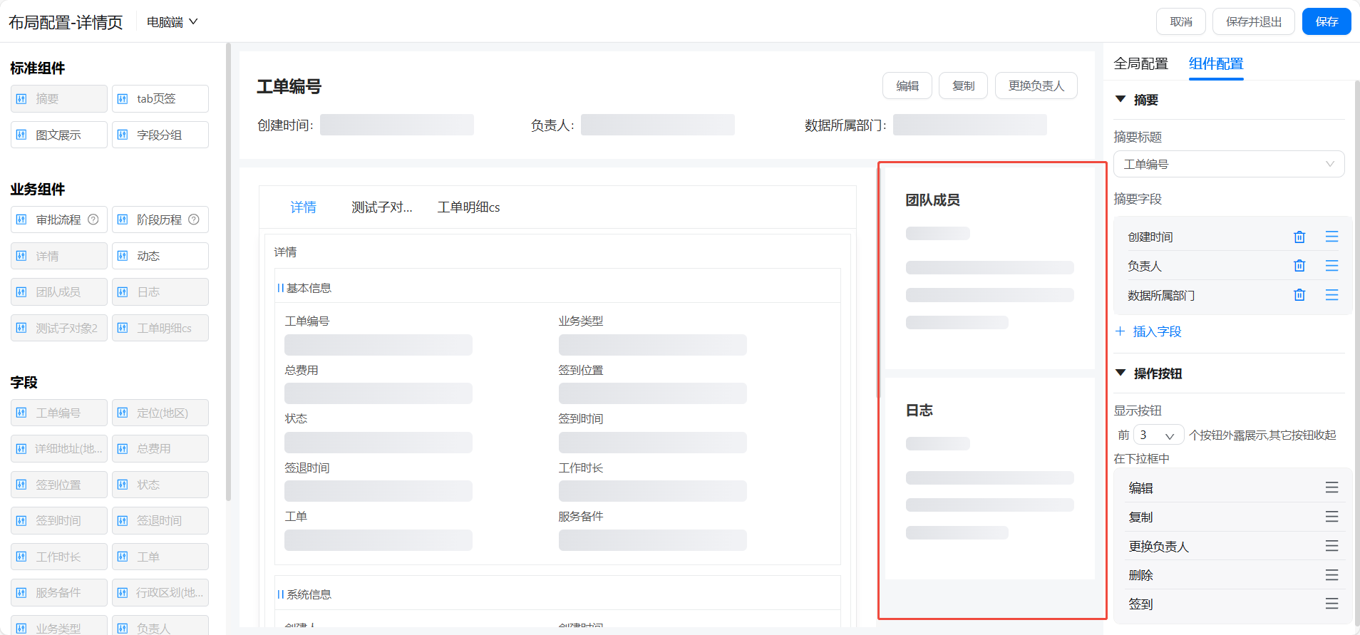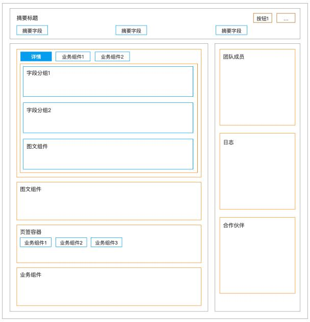 - 布局右侧卡片栏,仅支持业务组件团队成员、日志、合作伙伴放置此处。