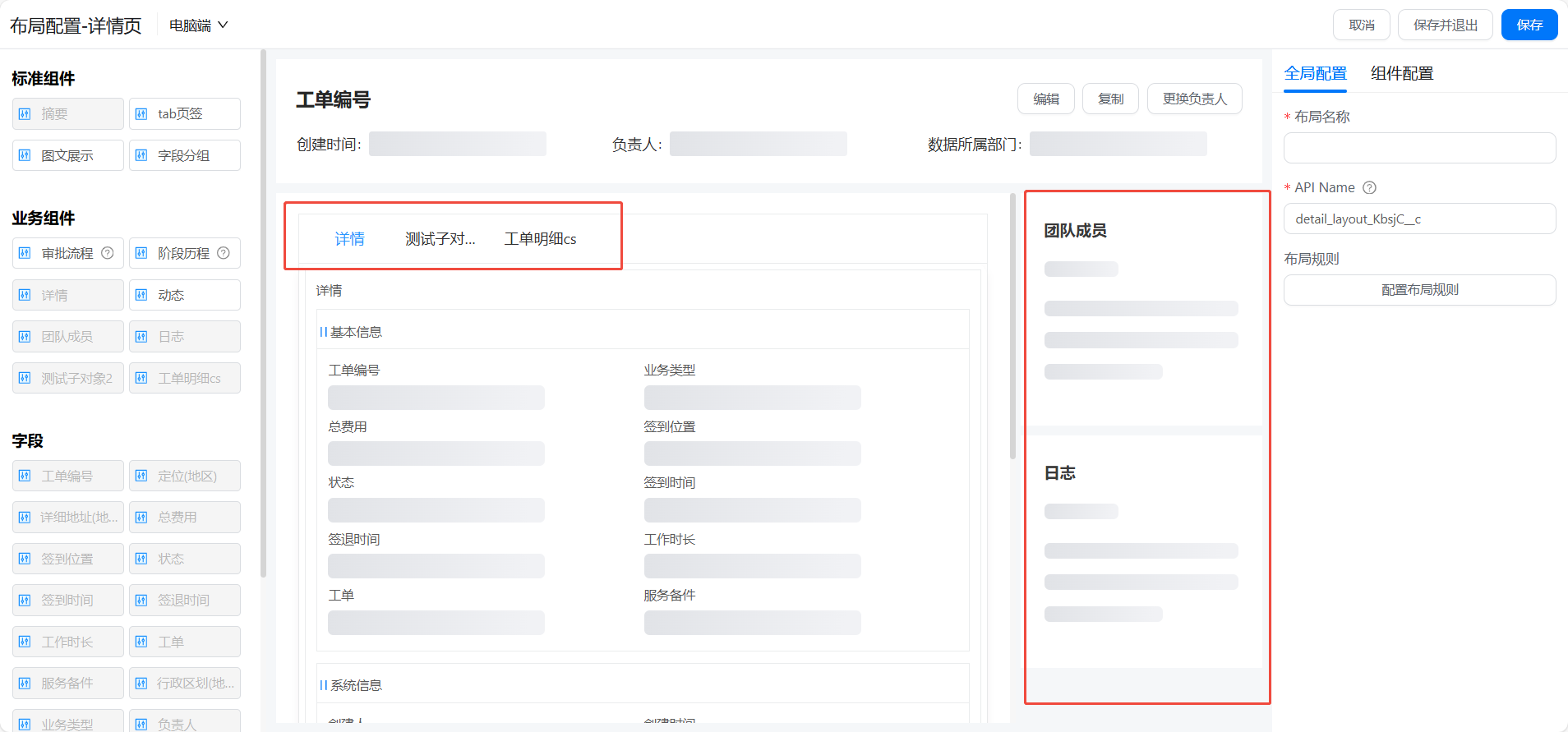 | 业务组件:详细信息、相关对象、从对象、日志、动态、审批流程、阶段历程、团队成员 | |