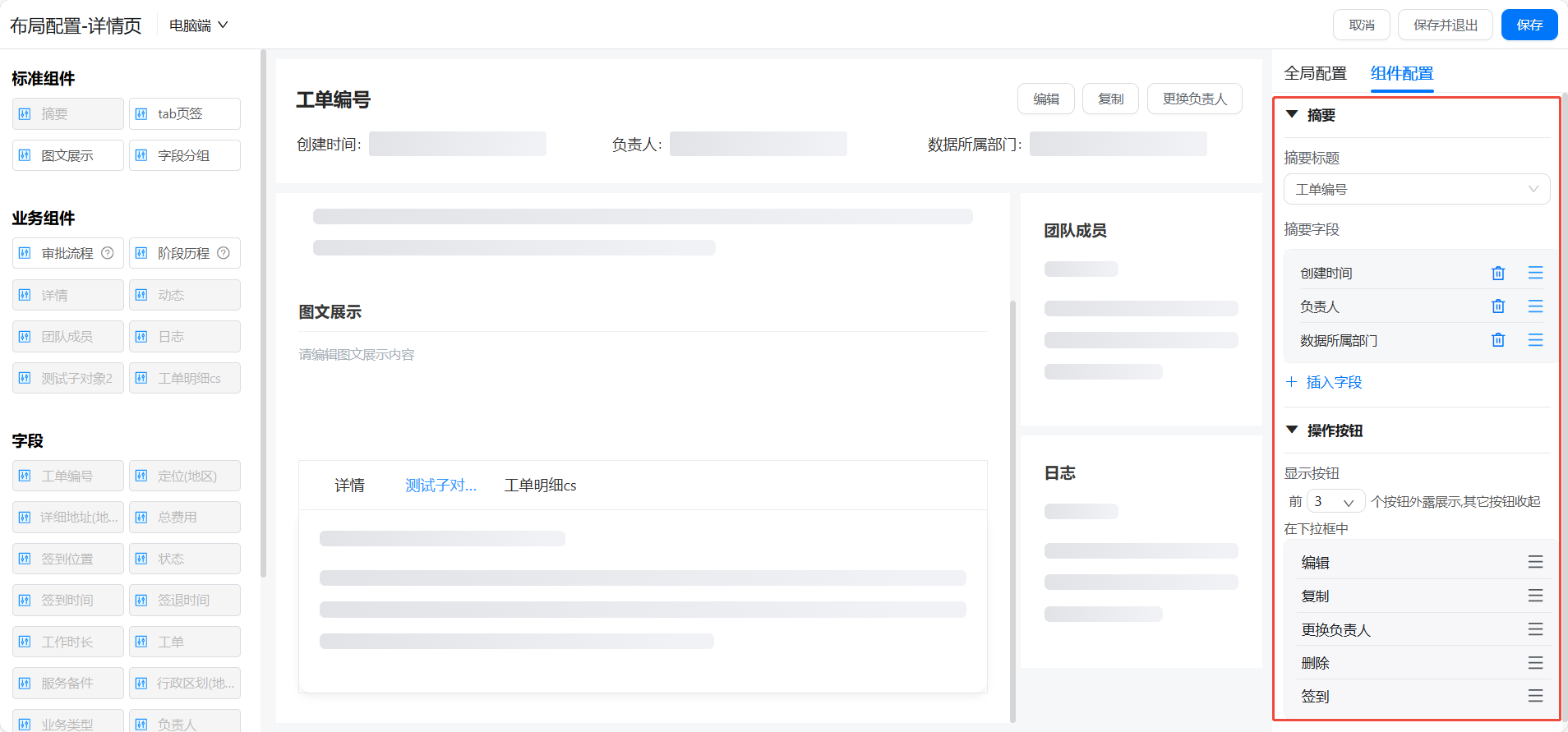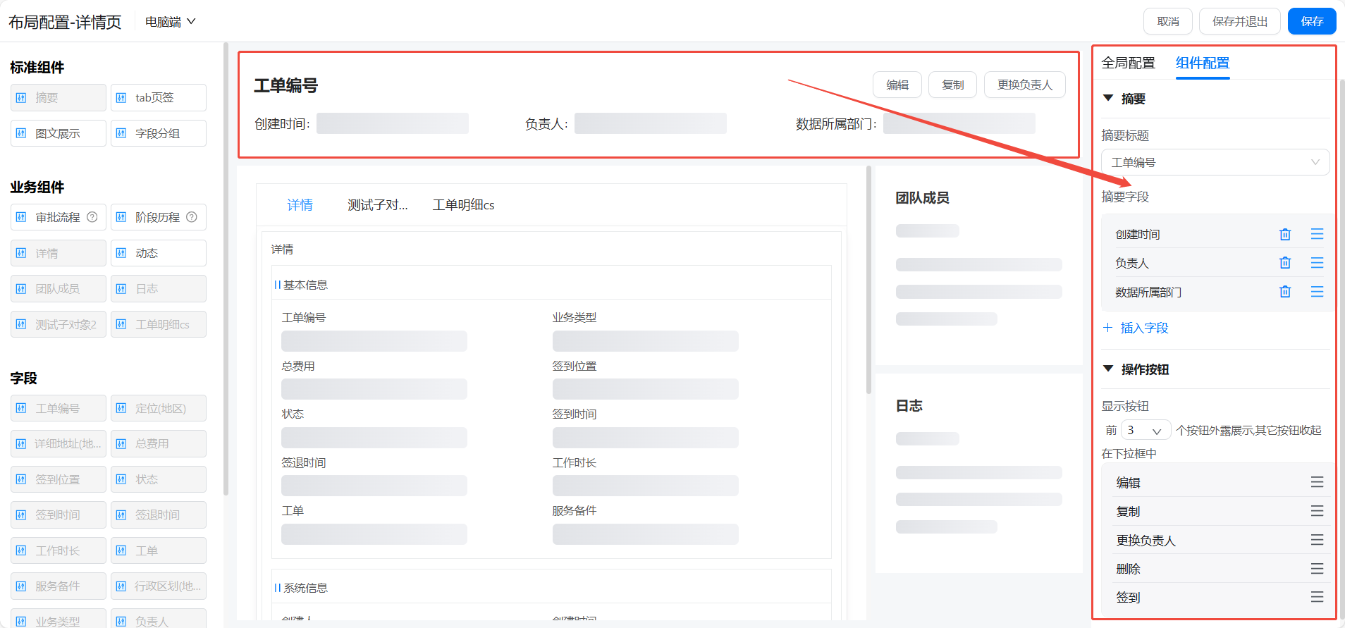 - 上方默认生成摘要信息栏,摘要标题、摘要字段以及相关操作按钮可以在【组件配置】中进行调整。