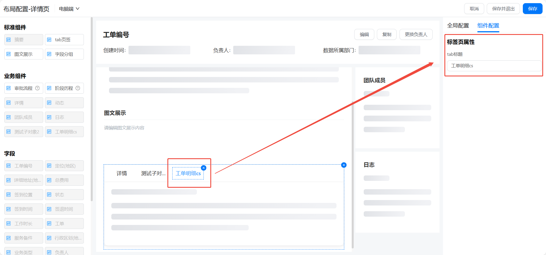 - 在页面配置区选中摘要、区域或者标签页可以进行进一步的属性编辑。