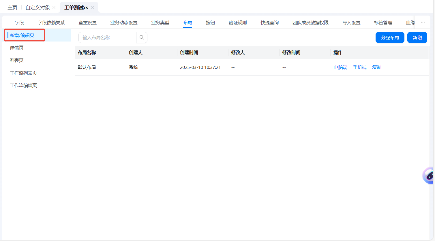 - 对象详情页面-->布局-->进入【新增/编辑页】页面,即可进行新增/编辑页布局设置。