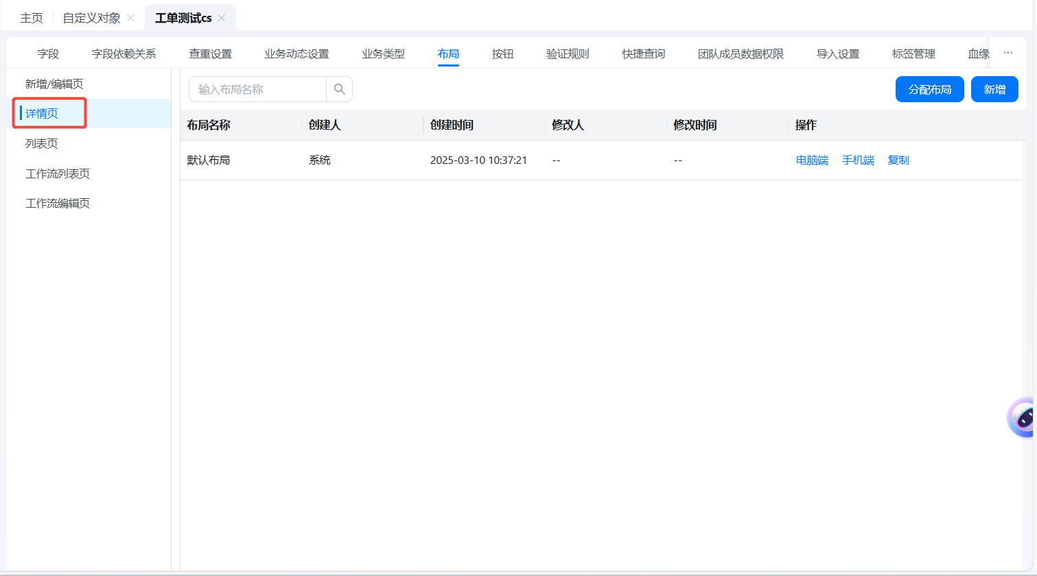 - 对象详情页面-->布局-->进入【详情页】页面,即可进行详情页布局设置。