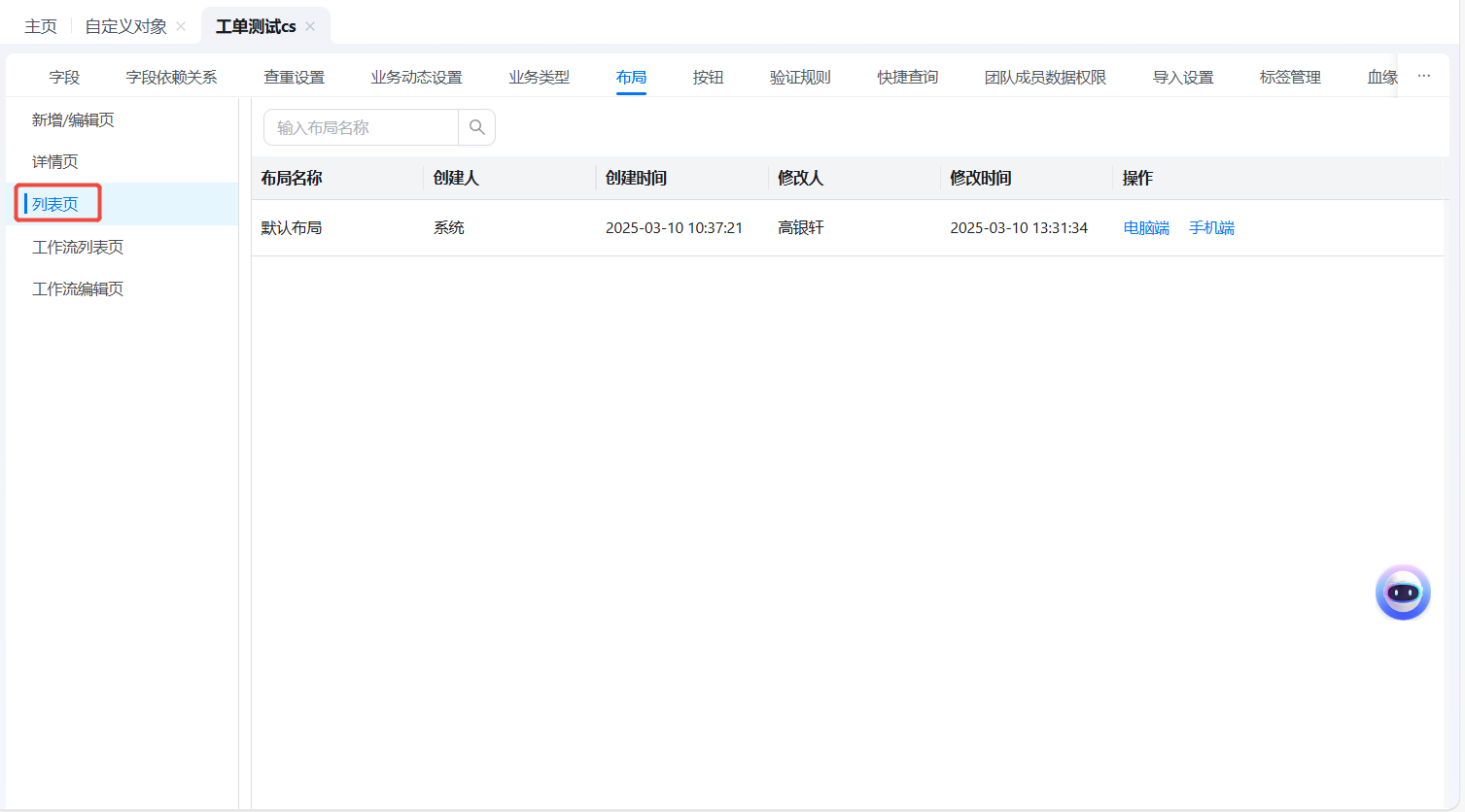 - 对象详情页面-->布局-->进入【列表页】页面,即可进行列表页布局设置。