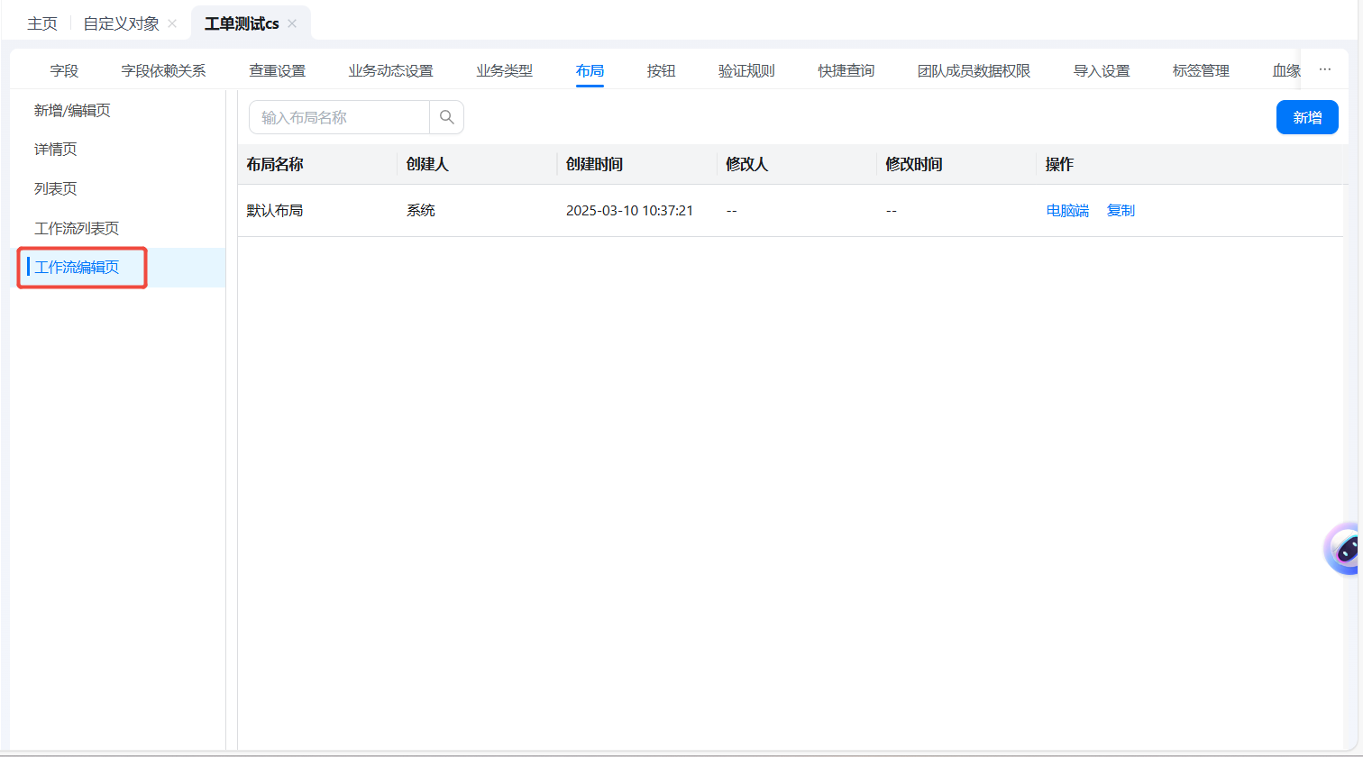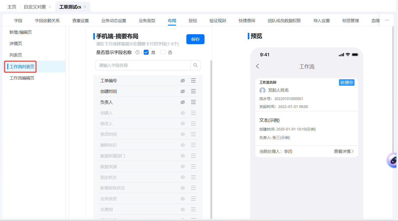 - 对象详情页面-->布局-->进入【工作流列表页】页面,即可进行工作流列表页布局设置。