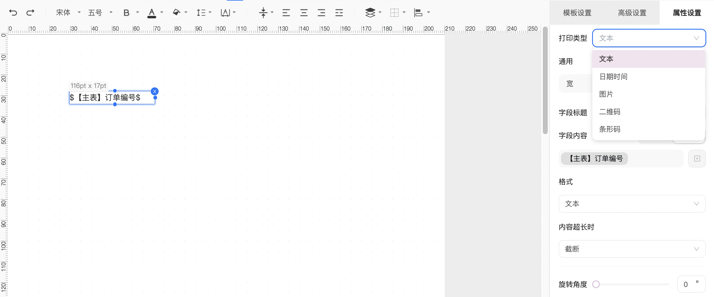 支持按选择的类型打印字段内容,打印类型支持:文本、日期时间、图片、条形码、二维码。