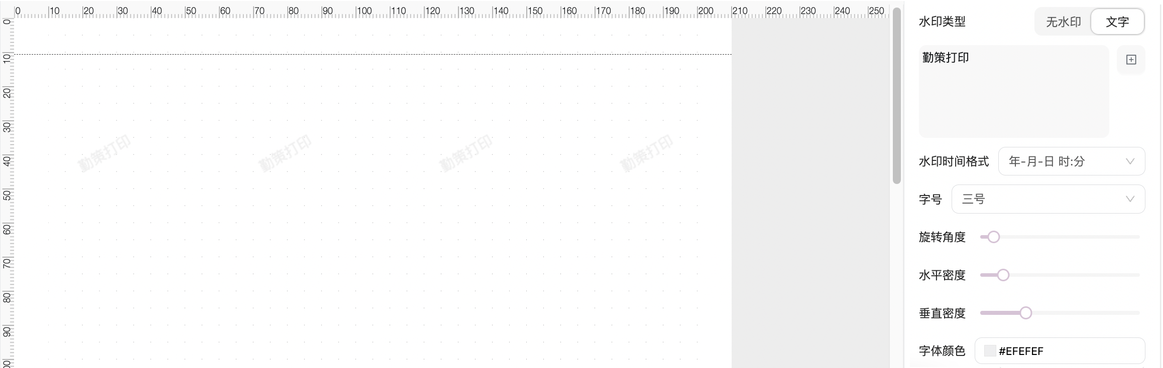 打印模板支持设置文字水印,文字水印支持设置水印格式:水印时间格式、字号、角度、水平密度、垂直密度、字体颜色。