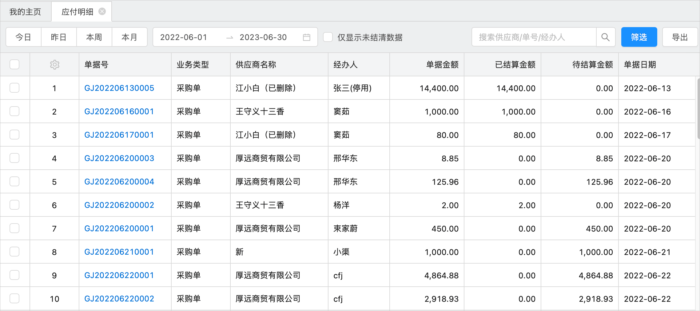 统计某时间段内企业的应付记录,可查询所有供应商的应付单据明细。
