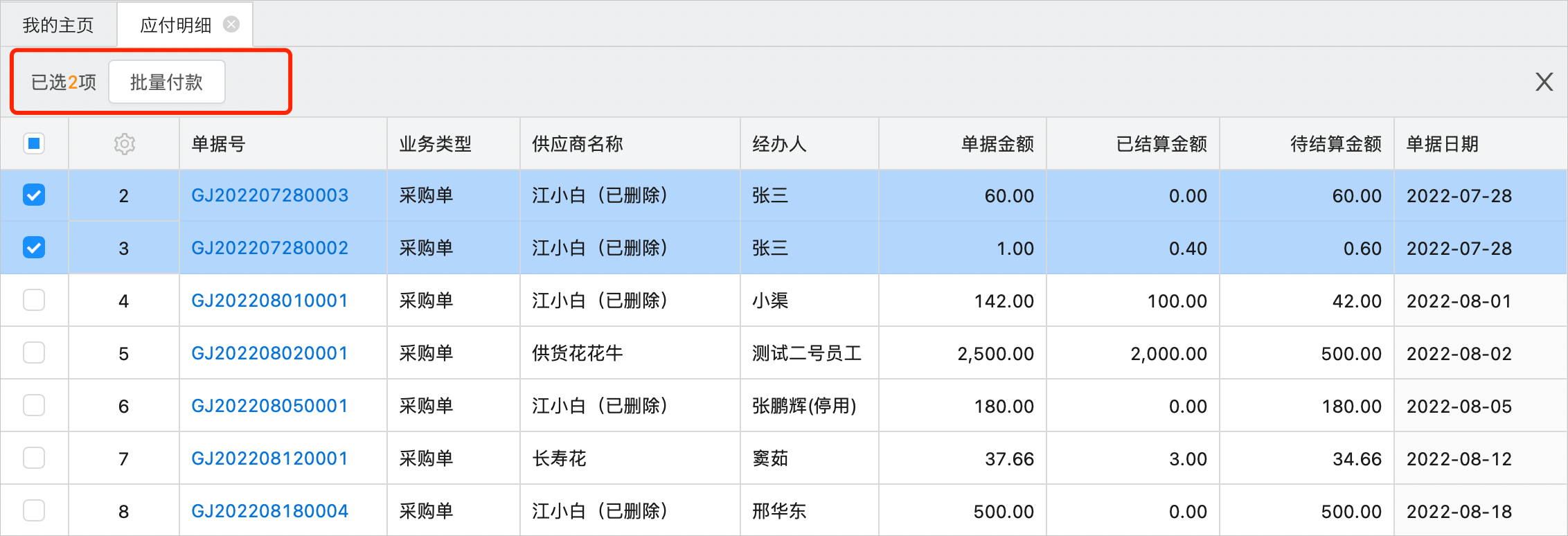 4、支持批量付款。选择单据后,可点击【批量付款】按钮