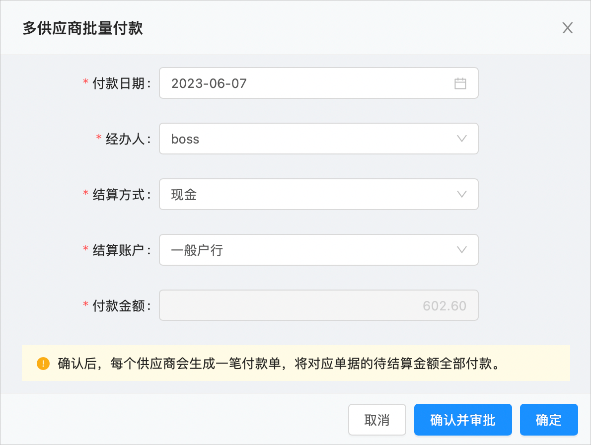 点击【确认】提交后,会对每笔应付单据生成待审批的付款单,相同供应商的合并在一张付款单上,并将对应单据的待结算金额全部付款;