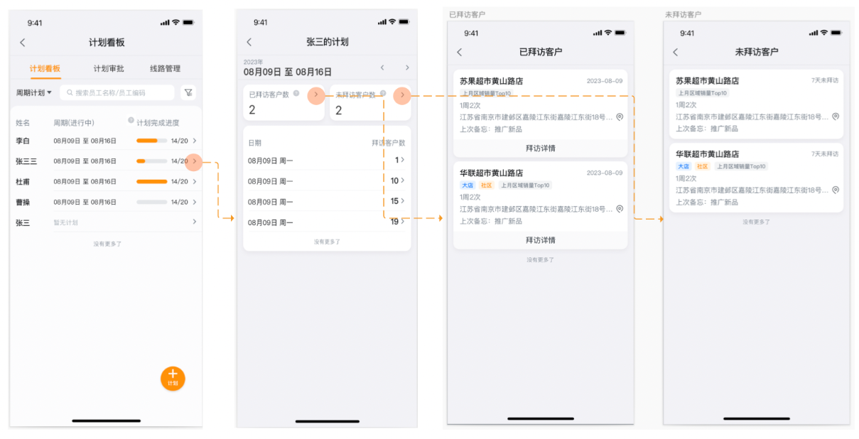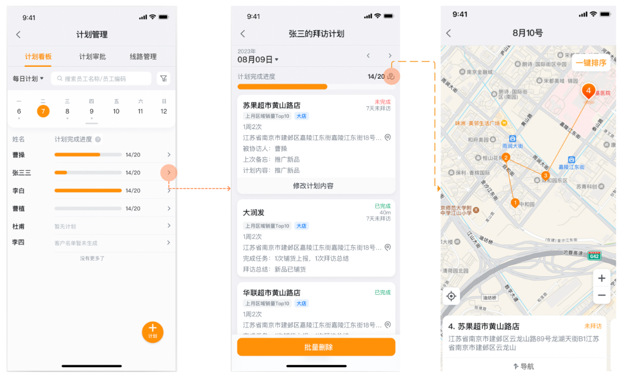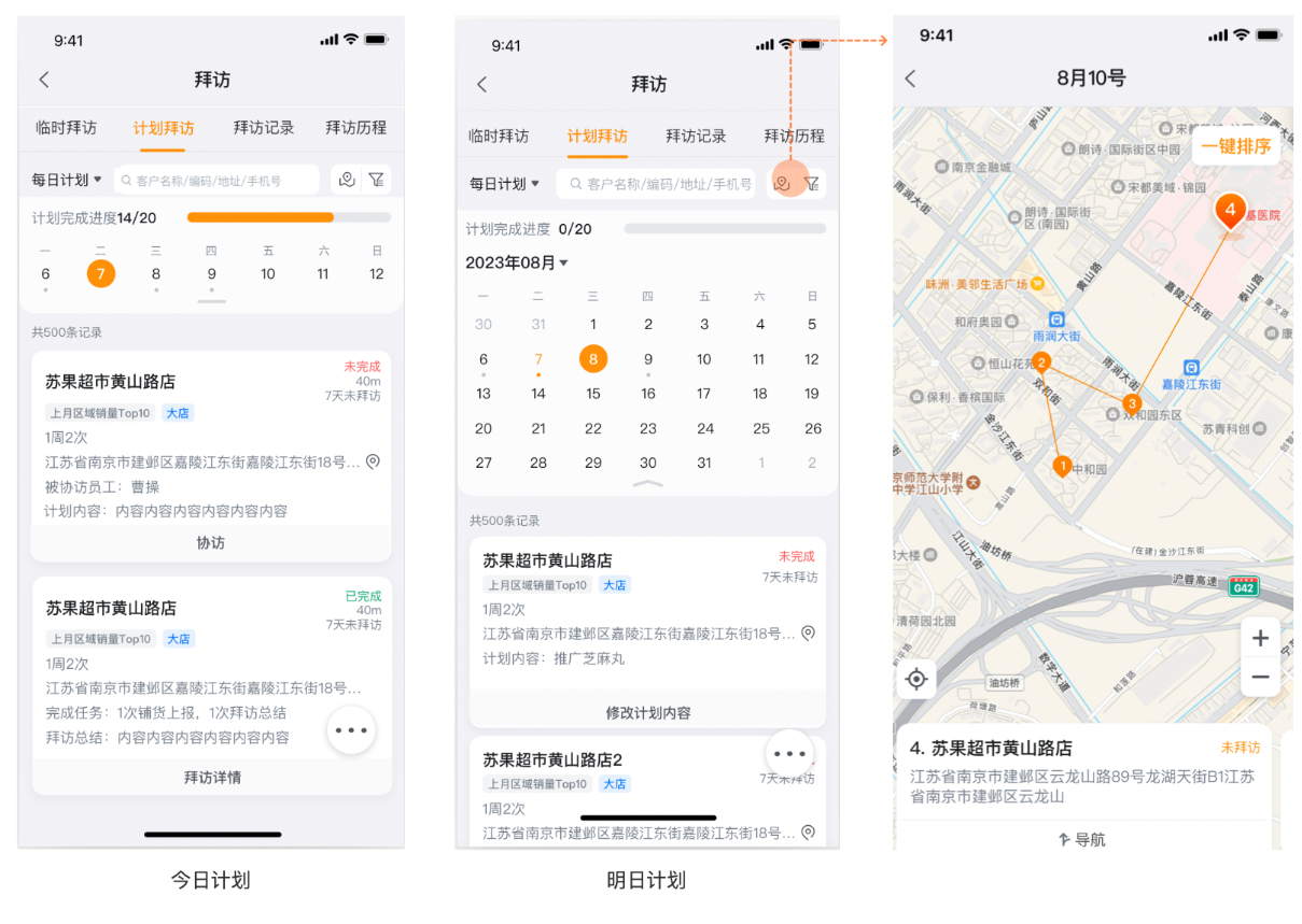 【列表】默认显示今日的所有计划(若企业使用审批流,不包含已打回、未审批的计划),显示优先级顺序:1)未拜访>拜访中>已拜访>失访;2)拜访类型(拜访>检核>协访);3)同一个拜访类型按计划创建的路顺进行排序;4)按拜访抵达时间升序;优先级存在先后顺序,若第一优先级相同,则按第二优先级排序,以此类推
