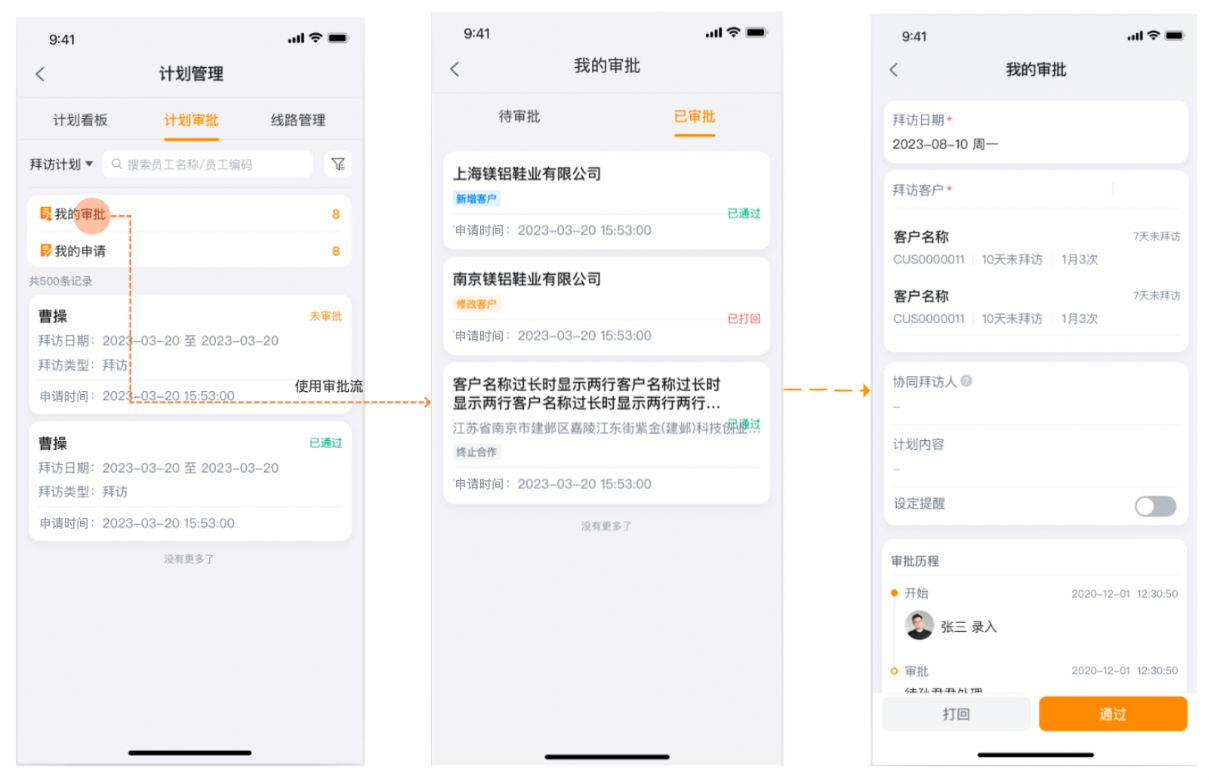 【企业差异】如果企业没设置审批流,则不展示“我的审批”“我的申请”入口,点击计划数据进行审批,仅支持“通过”、“打回”;未使用审批流的数据卡片没有“申请时间”信息