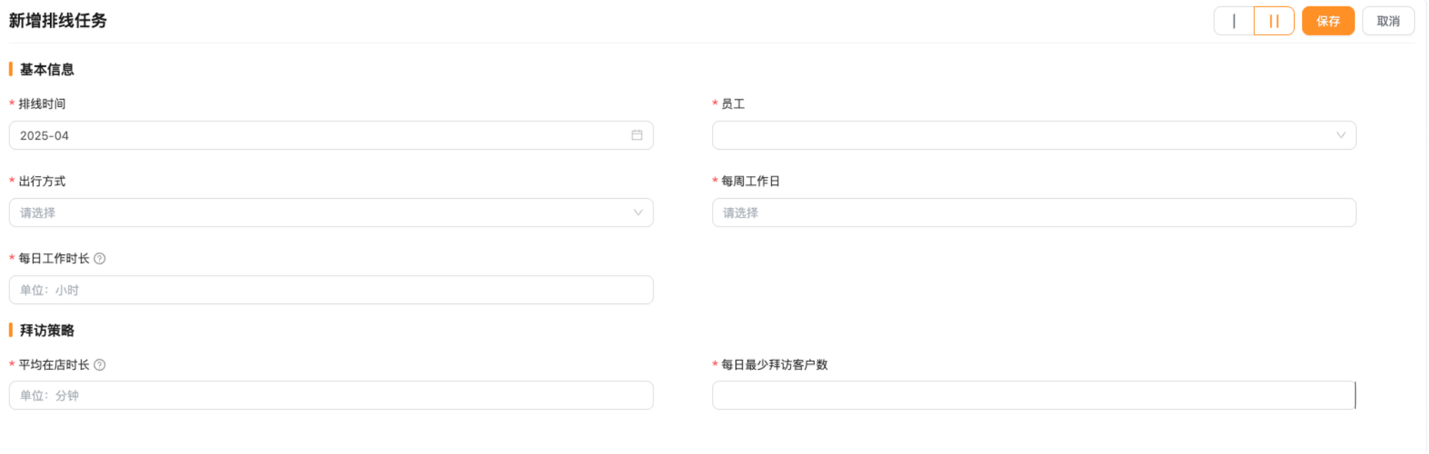 - 排线时间:即业务员的拜访时间区间,支持选择自然月范围生成拜访每个工作日的拜访路线;