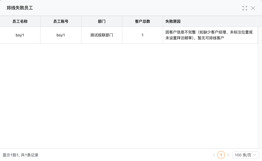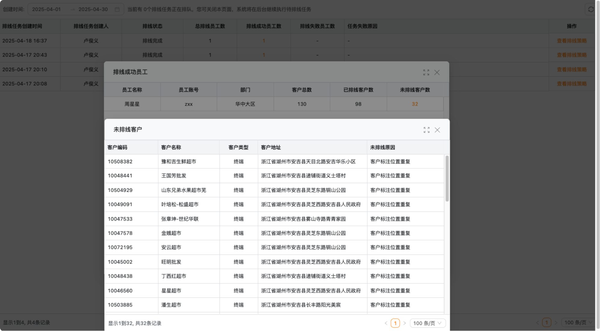 排线任务查看中心、排线成功员工弹窗、未排线客户弹窗