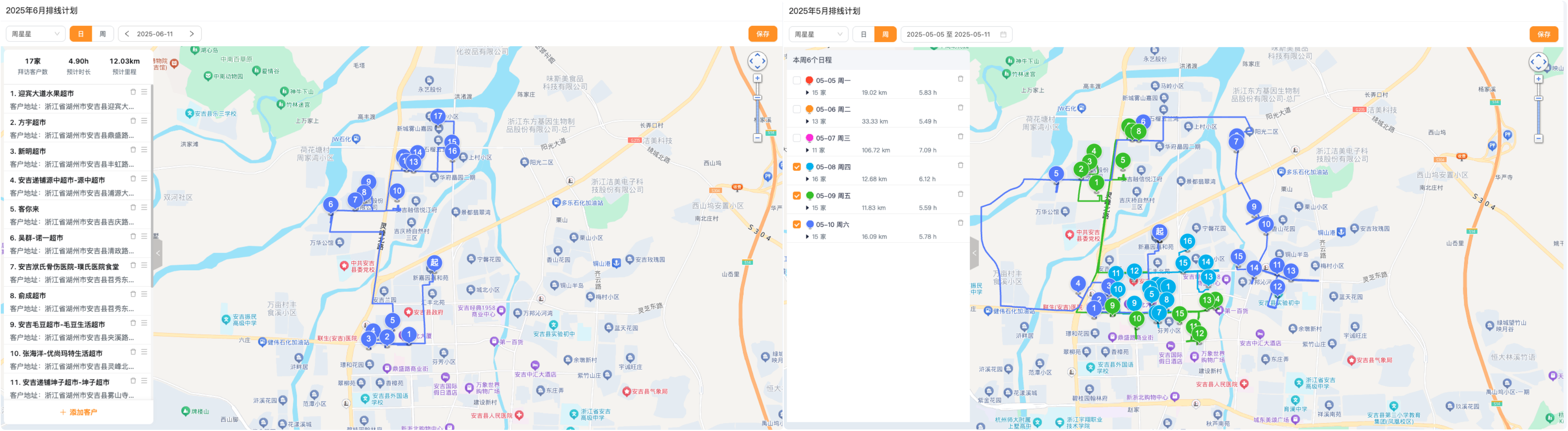 - 客户列表:展示当天或当周拜访路线信息(含客户名称、地址、总客户数、预计时长及里程),并支持调整客户顺序、新增或删除客户;