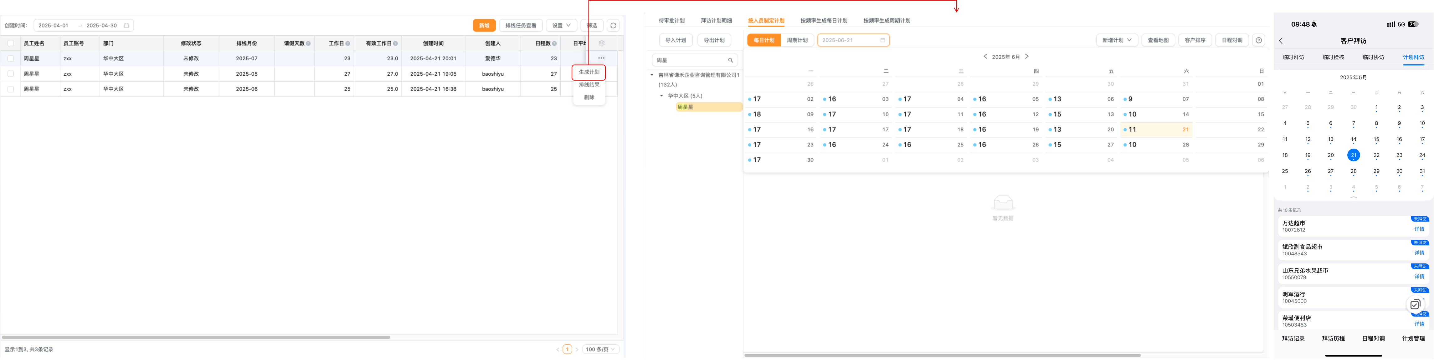 排线记录查看及计划生成。排线记录列表页面(左),电脑端拜访计划(中),手机端拜访计划(右)