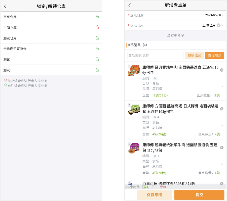 库管在手机端对企业库存进行盘点和审批。
