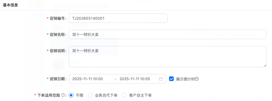 • 促销日期:设置秒杀活动的开始日期和结束日期。请精确到小时和分钟,确保活动在您期望的时间段内进行。