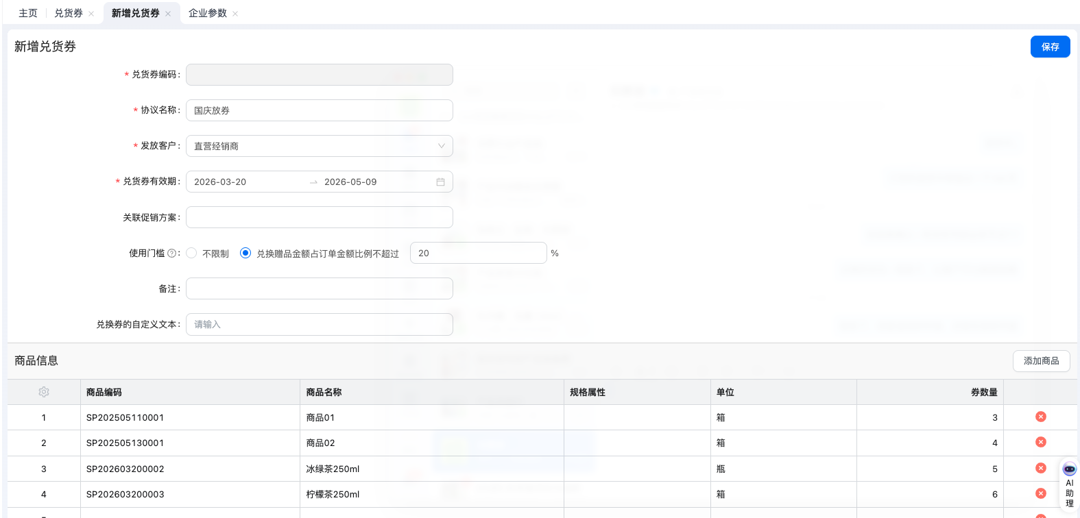 - 指定发放客户:明确该张兑货券的归属对象(如直营经销商或终端门店) 。