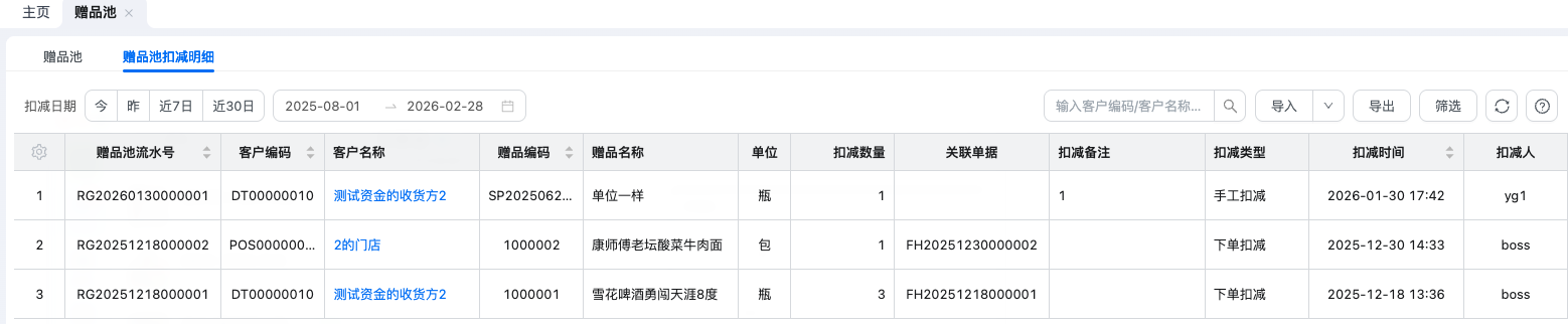 系统提供 [赠品池扣减明细] 专属菜单,为您提供全透明的账目分析 :