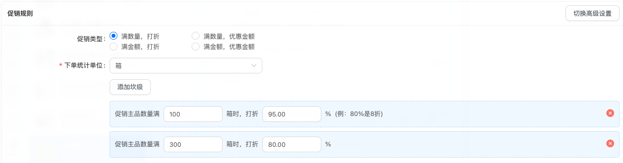 系统提供“简单规则”和“高级规则”两种设置方案,以满足不同复杂度的促销需求。