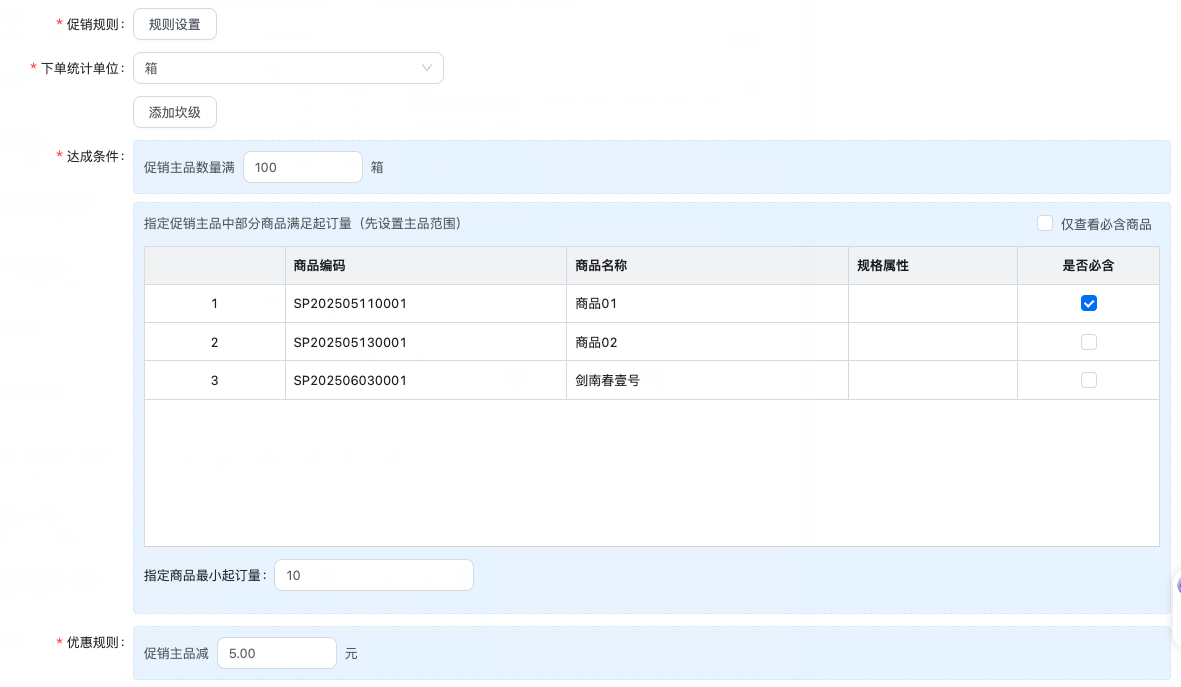 • 客户自主下单:仅当客户通过自助勤策订货系统下单时,促销才生效。