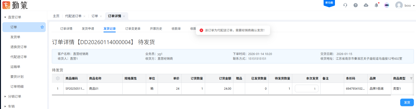 2.4.1 直营订单在新增的时候,如果发货仓库选择的是寄存仓库,该订单不能直接在订单中进行发货处理,需要在代配送订单中做调拨处理。