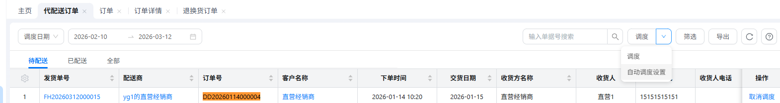 2.4.2 在待配送订单菜单中,可以进行“自动调度设置”操作。配置好后,在直营订单审批通过后,就会自动生成待配送订单。