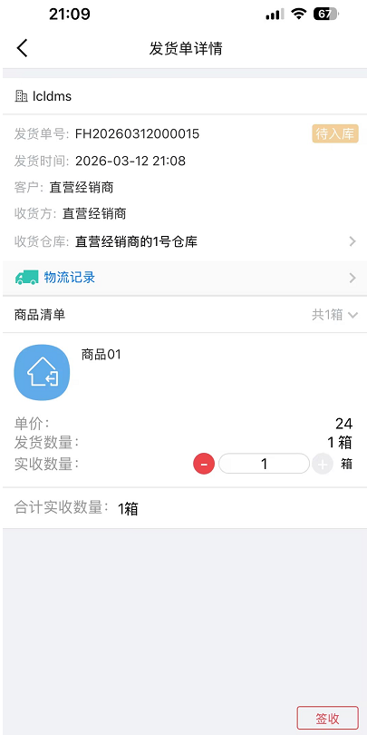 2.4.4 下单的经销商,登录经销商的门户,可以对发货单进行签收。