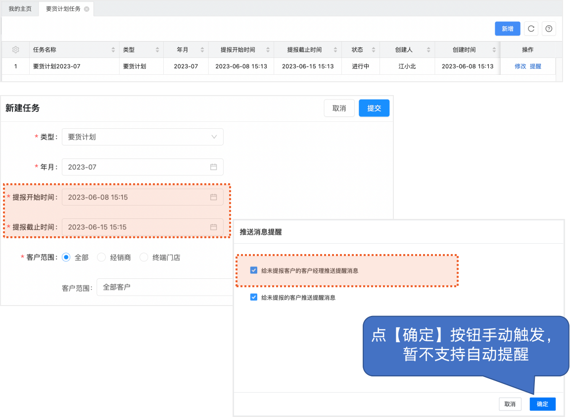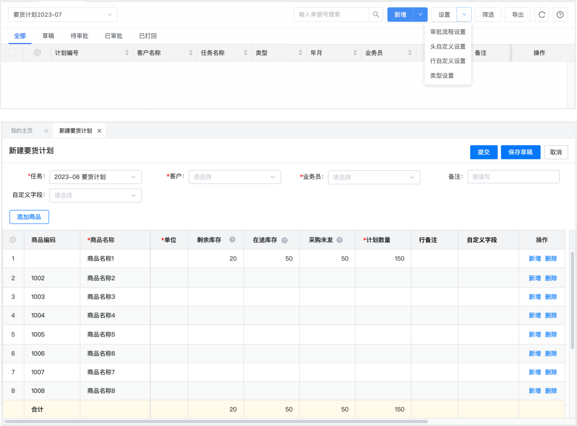 专员在电脑端导入或新增要货计划。要货计划功能要点: