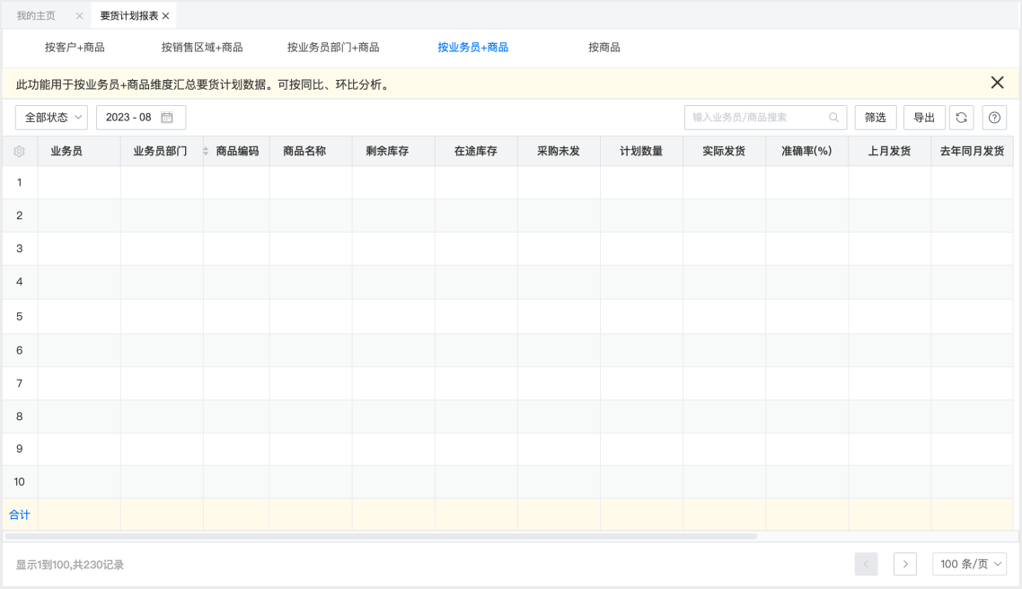 要货计划报表可汇总要货计划及计划准确率分析;可汇总查看上报时刻客户的剩余库存、在途库存、采购未发货数量;