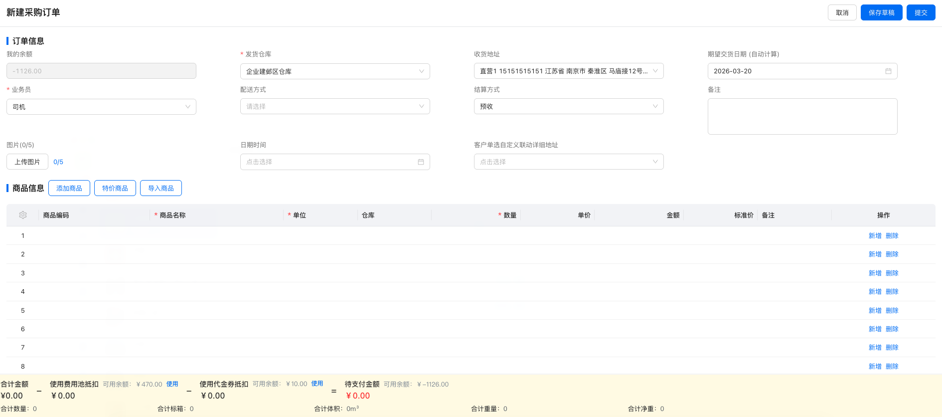 - 保存与提交:保存草稿:未确认的订单可先存为草稿。提交:正式下发至厂家后台进行审批。