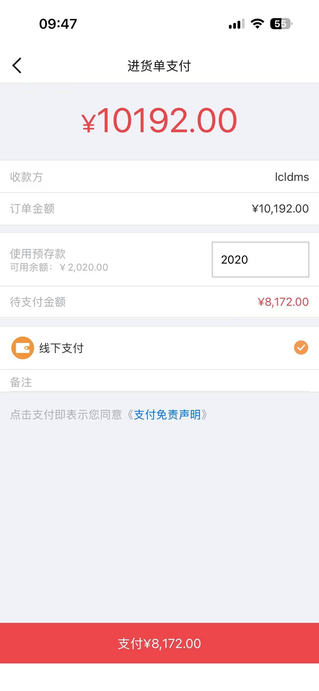在完成进货单确认后,您将进入 [进货单支付] 页面进行最终的资金结算。