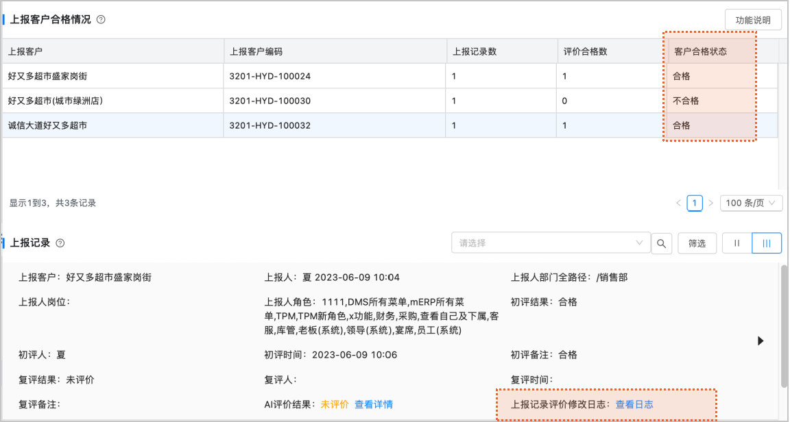- 上报记录分为两块,第一块展示上报客户的上报记录数、评价的合格数(有复评按复评),以及根据合格规则计算的合格状态。第二块展示上报记录。