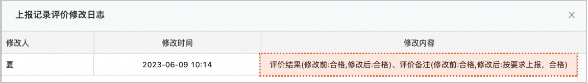 - 上报记录评价修改日志:展示修改前和修改后的评价结果、评价备注。