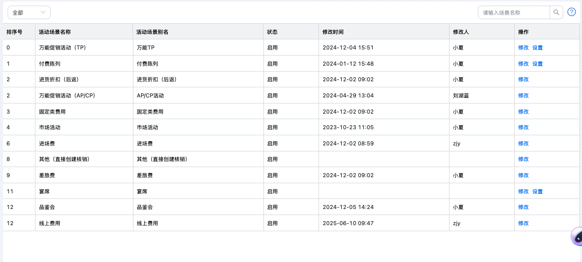 (新场景:万能促销活动TP、万能促销活动APCP、直接创建核销、宴席、品鉴会、线上费用);(老场景:付费陈列、进货折扣、固定类费用、市场活动、进场费、差旅费)