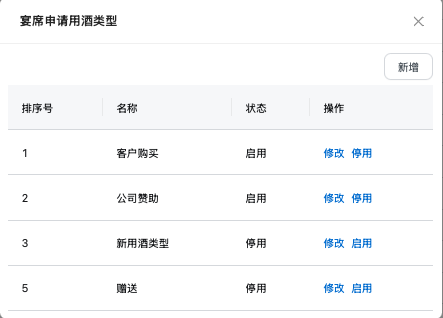 4.1 宴席:支持设置宴席申请用酒类型,用酒类型在活动申请时会有使用。