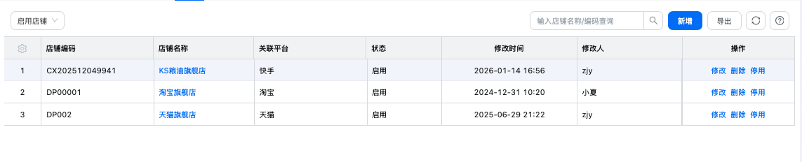 3、数据支持手工新增,单条数据操作支持“修改、删除、停用/启用”。“新增、修改、删除、停用/启用”这些按钮均受对应按钮权限控制。店铺支持停用和删除,停用后在店铺选择控件中会选不到。数据如果在申请中没有被选择过,支持删除,否则不支持删除
