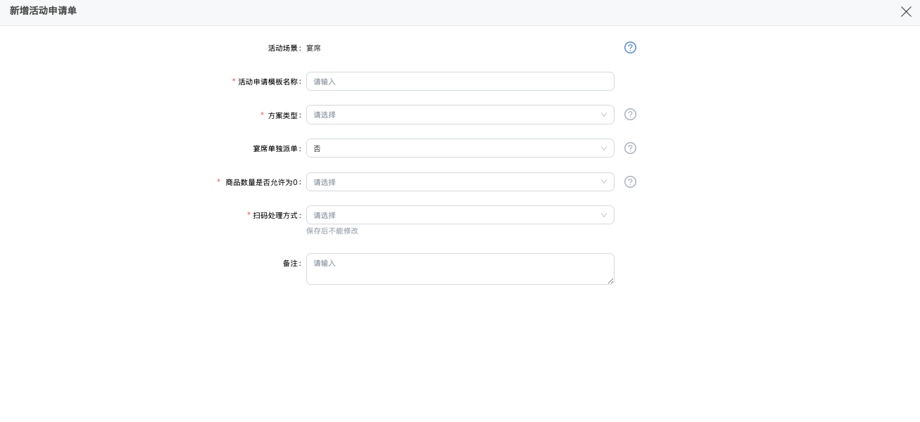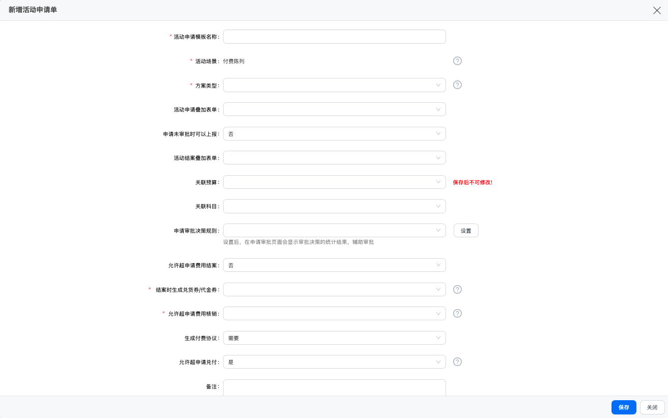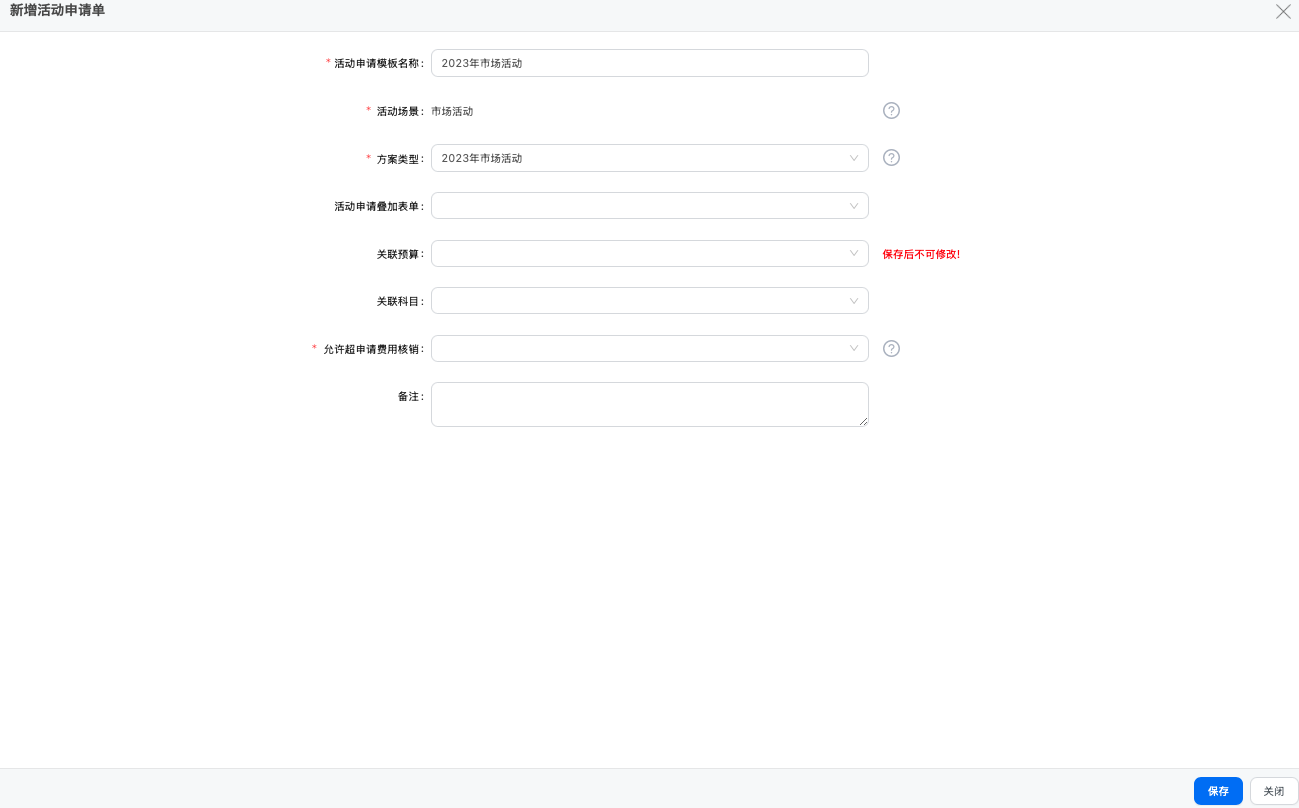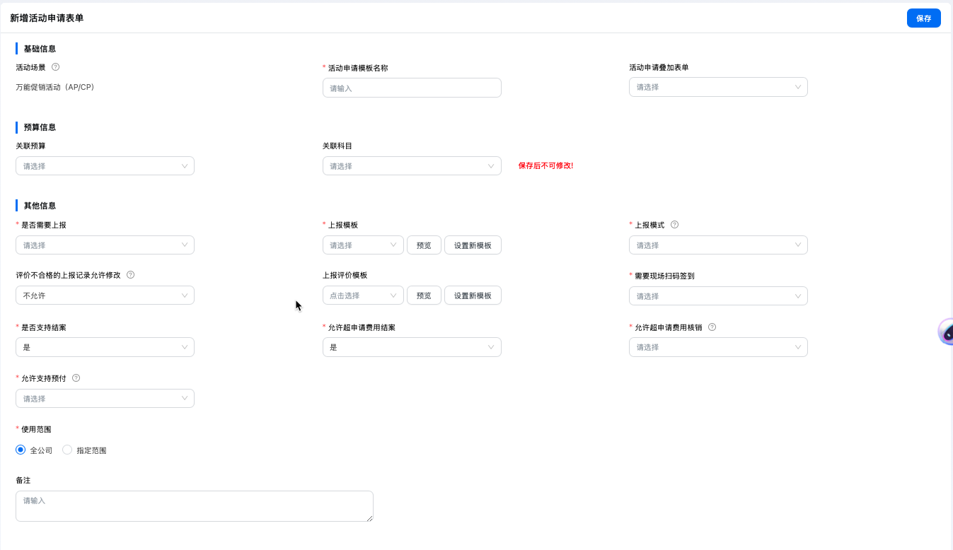 - 使用范围:哪些人员可以基于该申请单模版创建活动申请