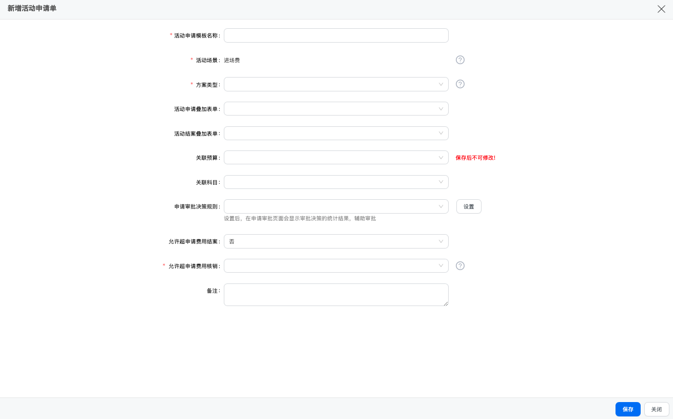 - 允许超申请费用结案:结案金额是否可以超活动申请金额