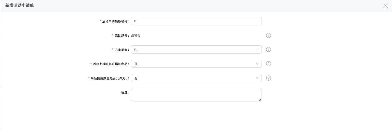 - 是否需要上报:控制该活动申请是否可以做活动上报,选择否,则在活动执行时选择不到该申请