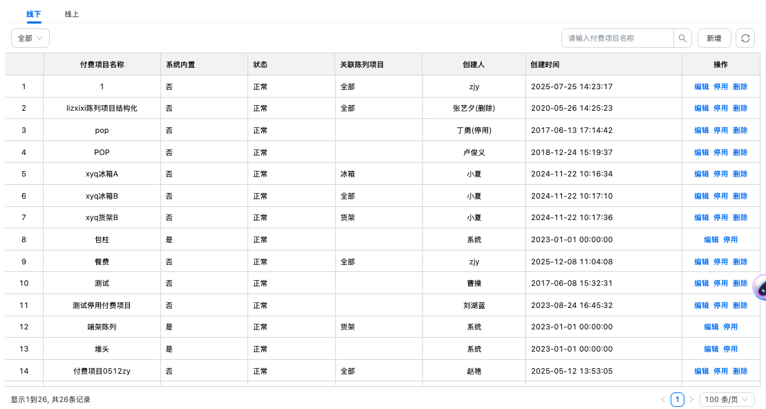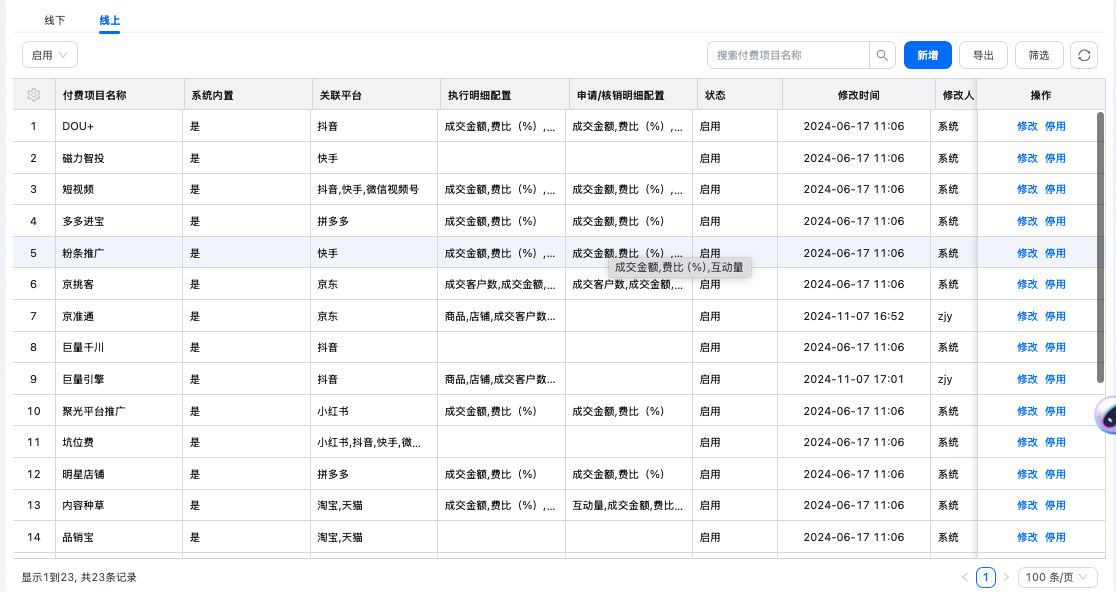 企业可依据实际业务定义付费项目,目前系统中的付费项目分为线下和线上两类,线上的付费项目仅适用于“电商费用场景”,线下付费项目适用于万能TP、付费陈列、品鉴会等场景。“付费项目”是一个广义的概念,不单单指陈列场景中的堆头、货架等陈列形式,可以理解为投放费用的对象,简言之为什么而付费,比如一场大卖场活动、一个促销员的工资等均可以视为一个付费项目。