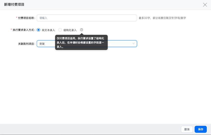 - 执行要求录入方式:其中结构化录入仅适用于付费陈列,万能场景后续是通过费用标准实现,所以在付费项目层面万能TP仅支持纯文本录入。