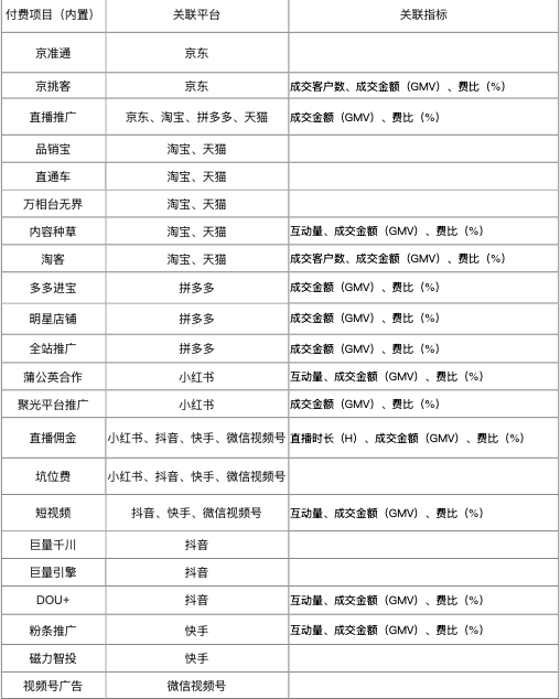 内置指标包含:展现量、点击量、千次展现成本、平均点击成本、访客数(UV)、访问数(PV)、成交转化率、订单金额、付款金额、退款金额、成交客户数、成交新客数、成交件数、成交客单价、成交金额(GMV)、成交UV价值、直播时长(H)、平均观看人数、新增粉丝数、单小时下单金额、商品点击人数、商品点击次数、商品点击成交转化率(人数) 、费比(%)、单位成本、点赞量、收藏量、评论量、分享量、关注量、互动量