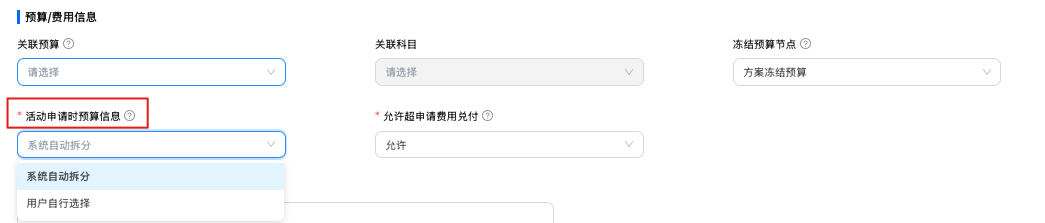 2、当选择“系统自动拆分”时,活动申请人无需选择预算信息,系统根据对应方案上所选预算行,按可用比例自动把活动申请金额拆分到对应预算行中;当选择“用户自行选择”时,活动申请人自行选择使用活动方案范围内的具体预算信息。
