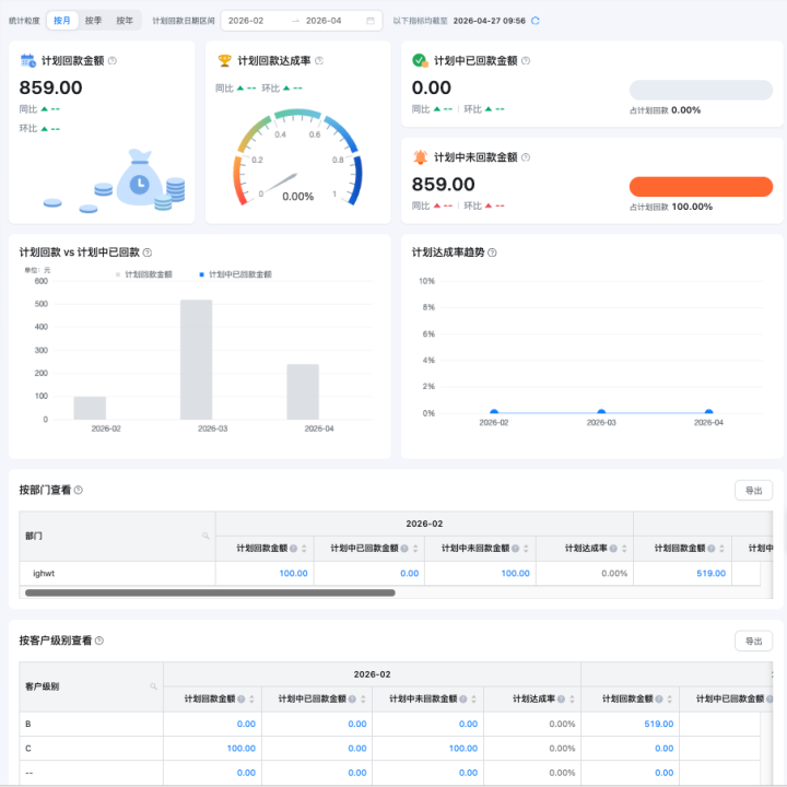 - 复盘过去:按不同时间周期(如月、季、年)直观展示:计划该收回多少钱、实际已经收回多少钱、还有多少没收回来,以及整体的回款计划完成率,复盘过去回款计划执行情况。