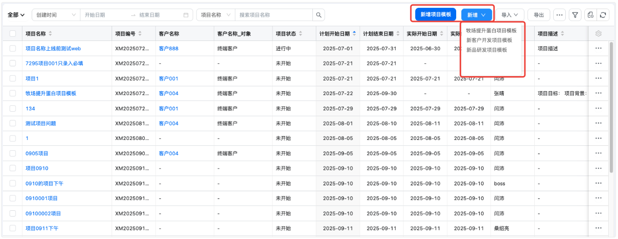 项目模板中按企业标准设置项目阶段计划、项目任务,提交审批通过后,将在【新增】按钮下拉选项中展示。