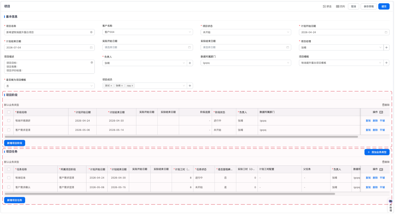支持业务人员在系统录入项目时,可使用项目模板一键复制项目阶段和项目任务: