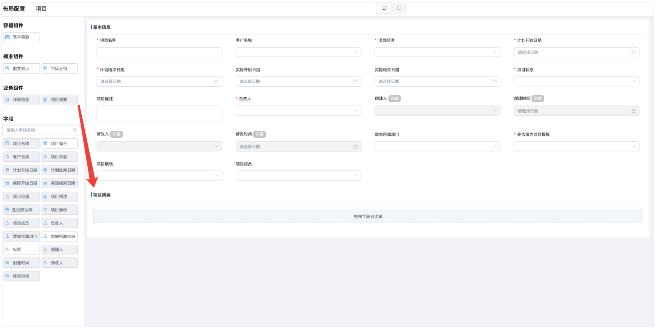 配置说明:需在预置对象【项目】布局-工作流编辑页中拖入【项目摘要组件】