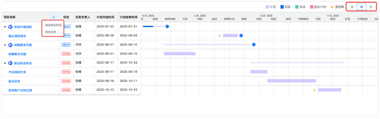 1.3.2 项目甘特图自适应“周视图”“月视图”,支持快速新增项目阶段、项目任务